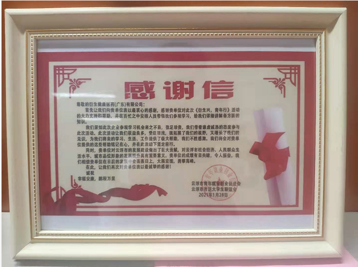 云浮市市區(qū)大學(xué)生聯(lián)誼會(huì)贈(zèng)予衍生健康醫(yī)藥感謝信